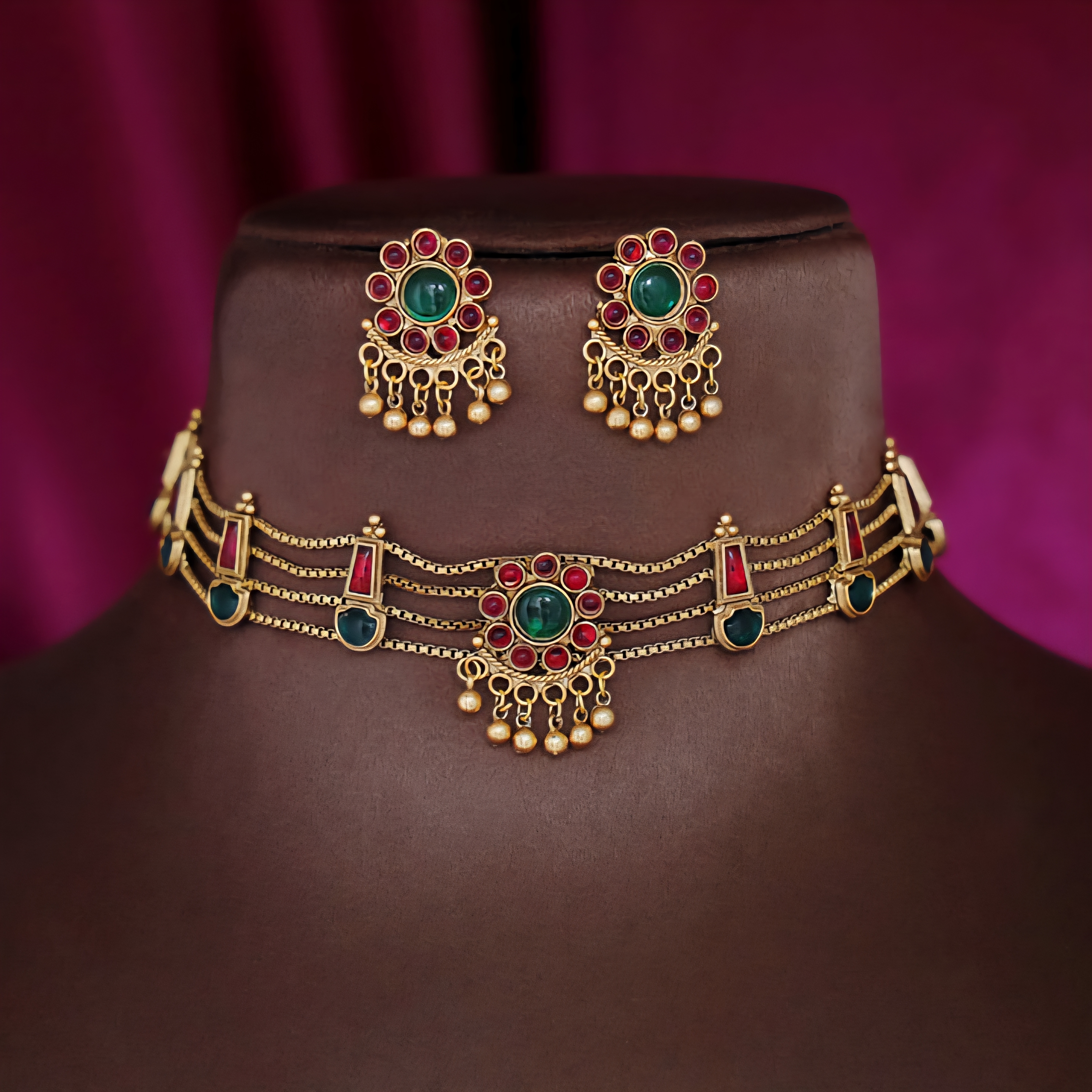 CHOKER SET Temple Style Matte Gold Plated Choker Necklace Set Available in Full Red, Full Green & Dual RedGreen Stone Variants
