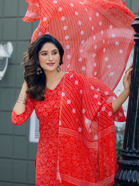 Women Cotton Blend Printed Kurti With Pant Dupatta Set Orange