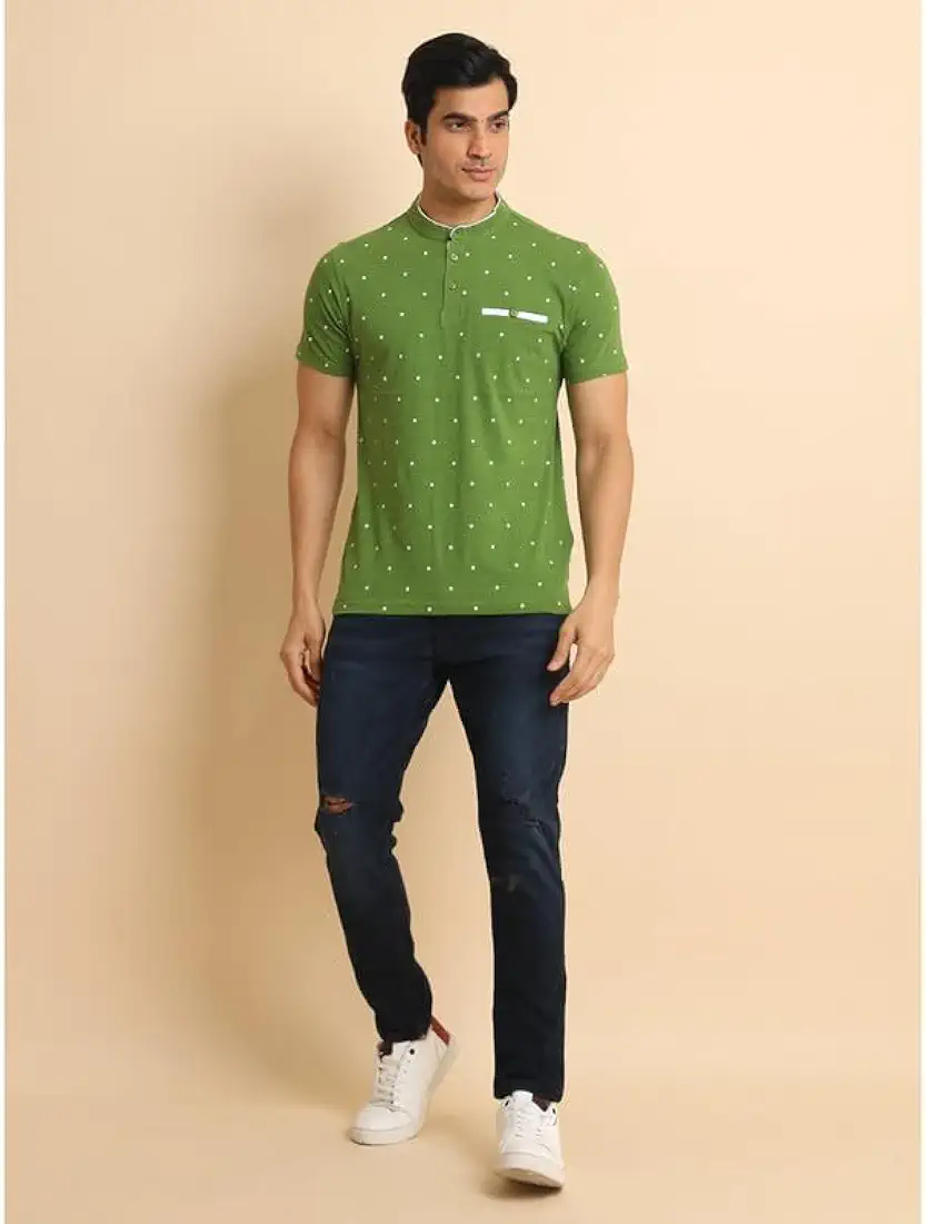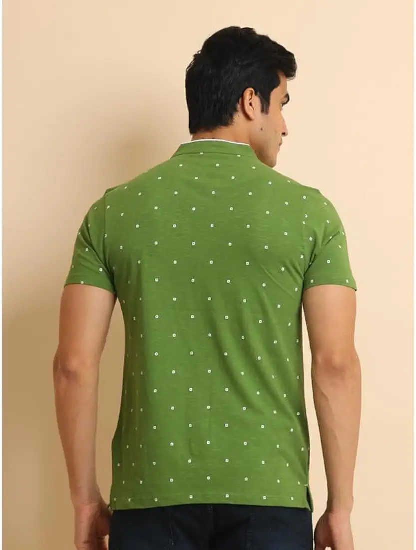 Men Casual Cotton Printed Mandarin Collar Half Sleeve T-Shirt Green