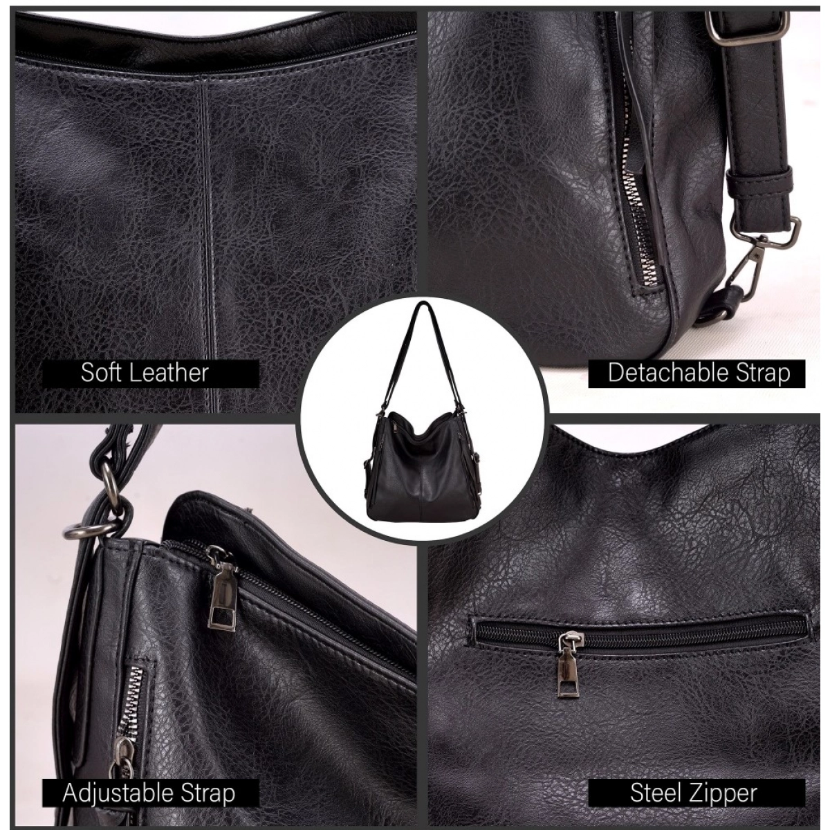 Women PU Leather Medium Shoulder Zipper Handbag Black