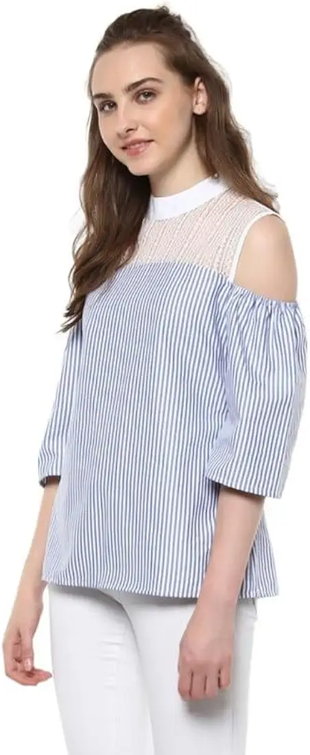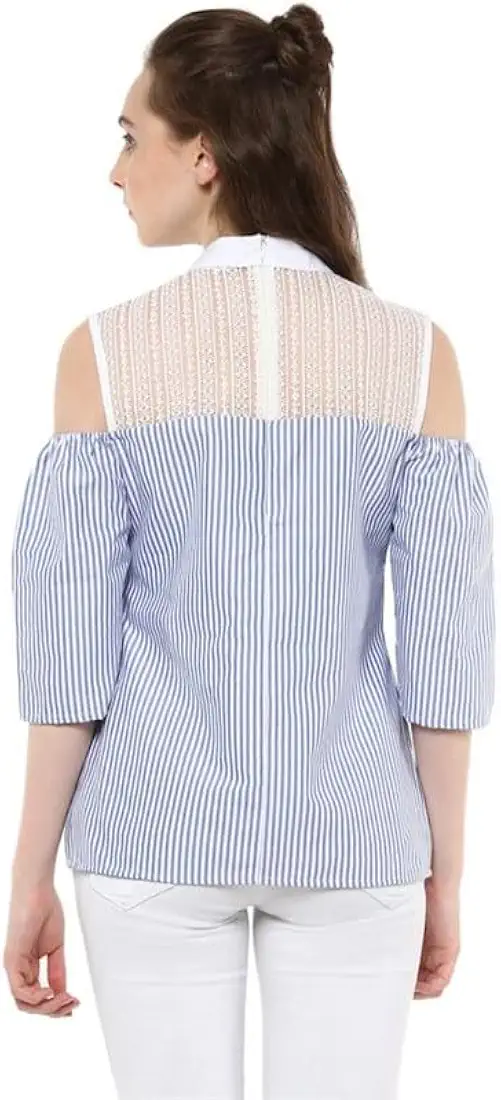 Generic Womens Cotton Striped Cold Shoulder Top Blue