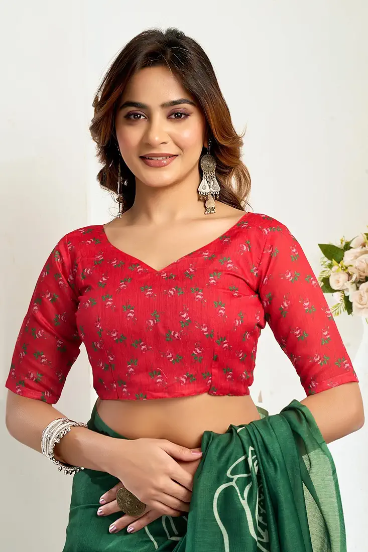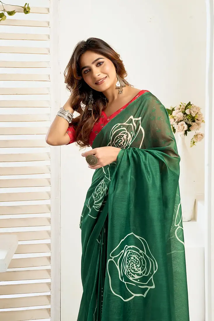 Women s Faux Linen Printed Ready toWear Saree With Unstitched Blouse Dark Green