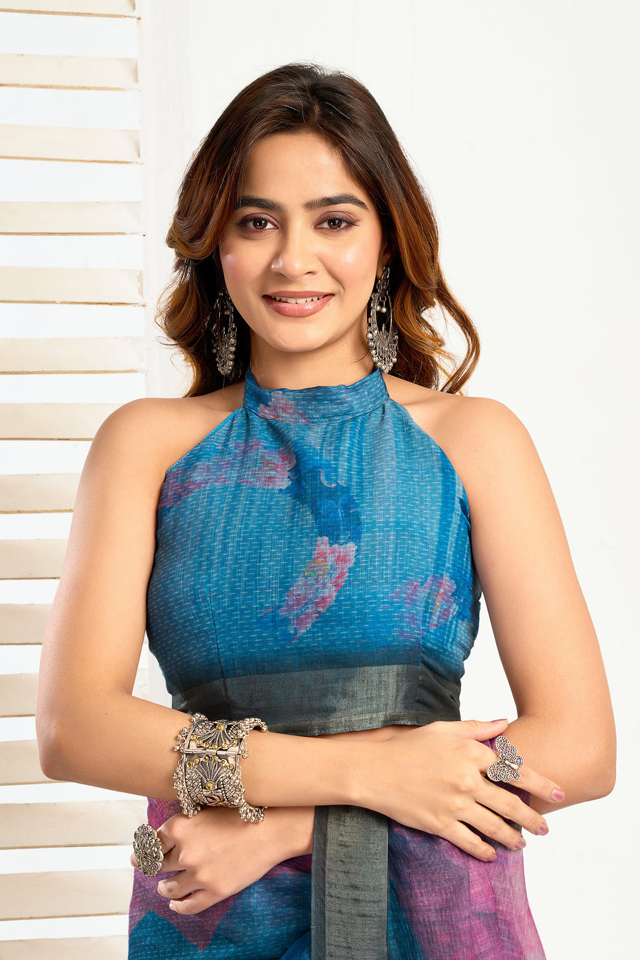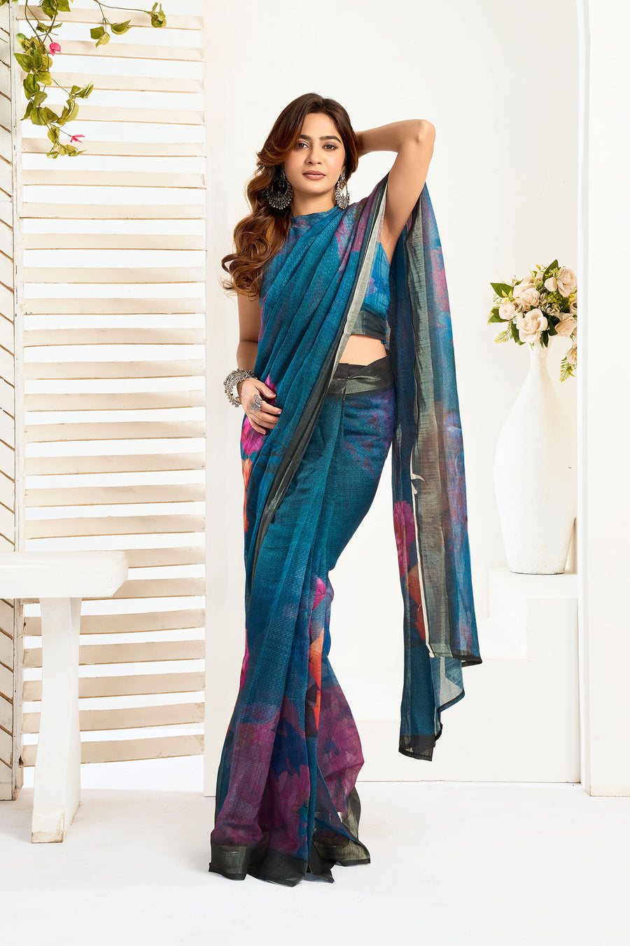 Women s FauxLinen Printed ReadytoWear Saree With Unstitched Blouse Teal