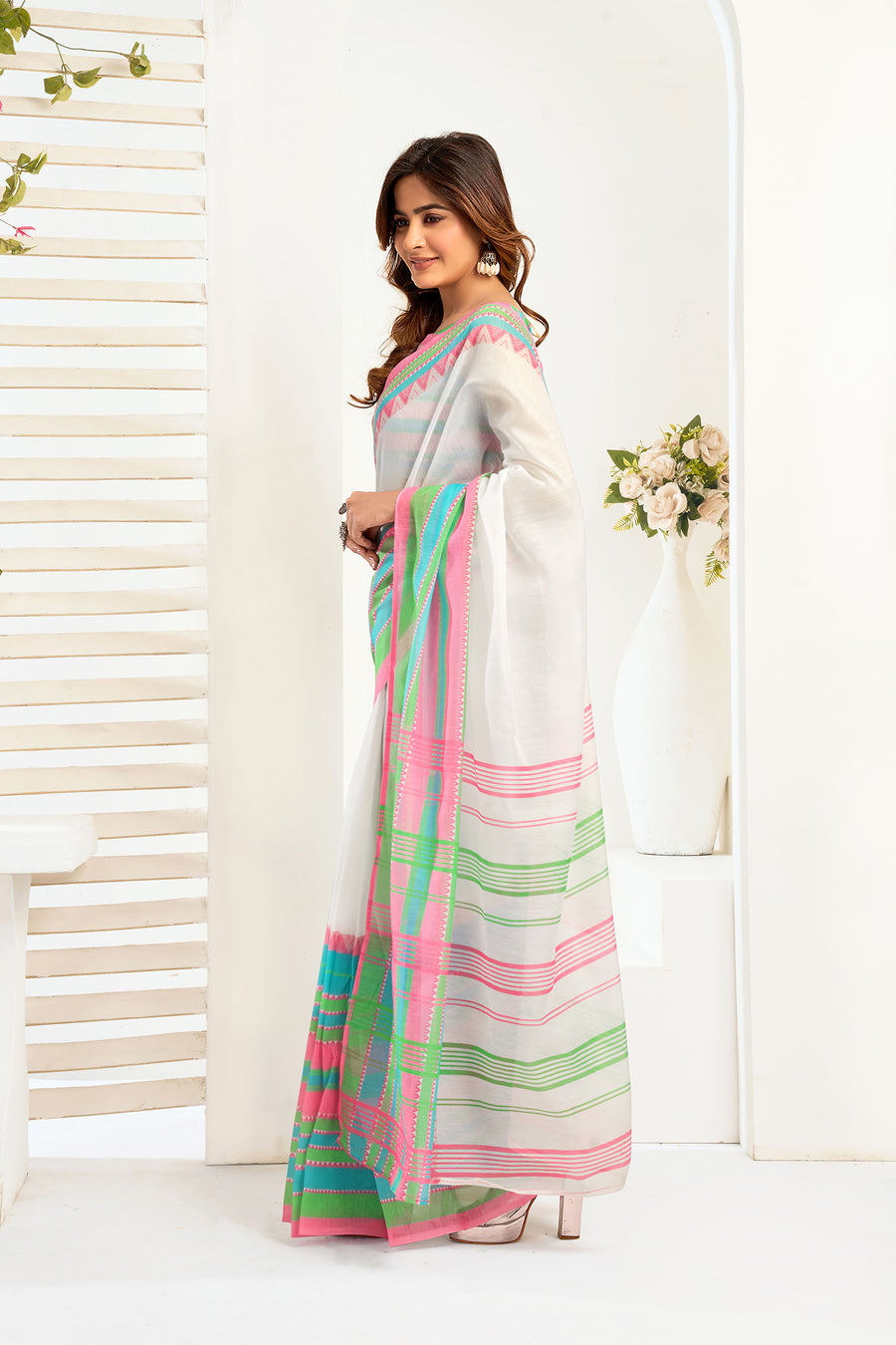 Women s Faux Linen Printed Ready to Wear Saree With Unstitched Blouse White