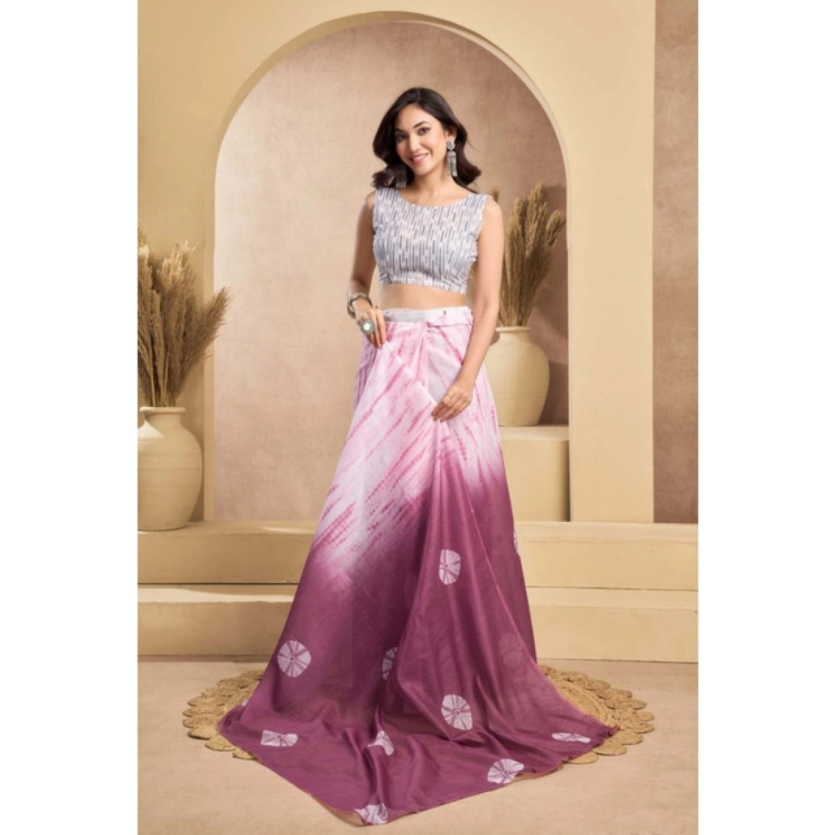 Womens Faux Linen Printed Ready to Wear Saree With Unstitched Blouse wine