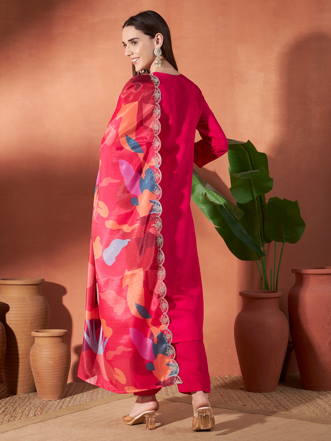 PINK ROMAN FABRIC KURTA PANT and DUPATTA ETHNIC SET