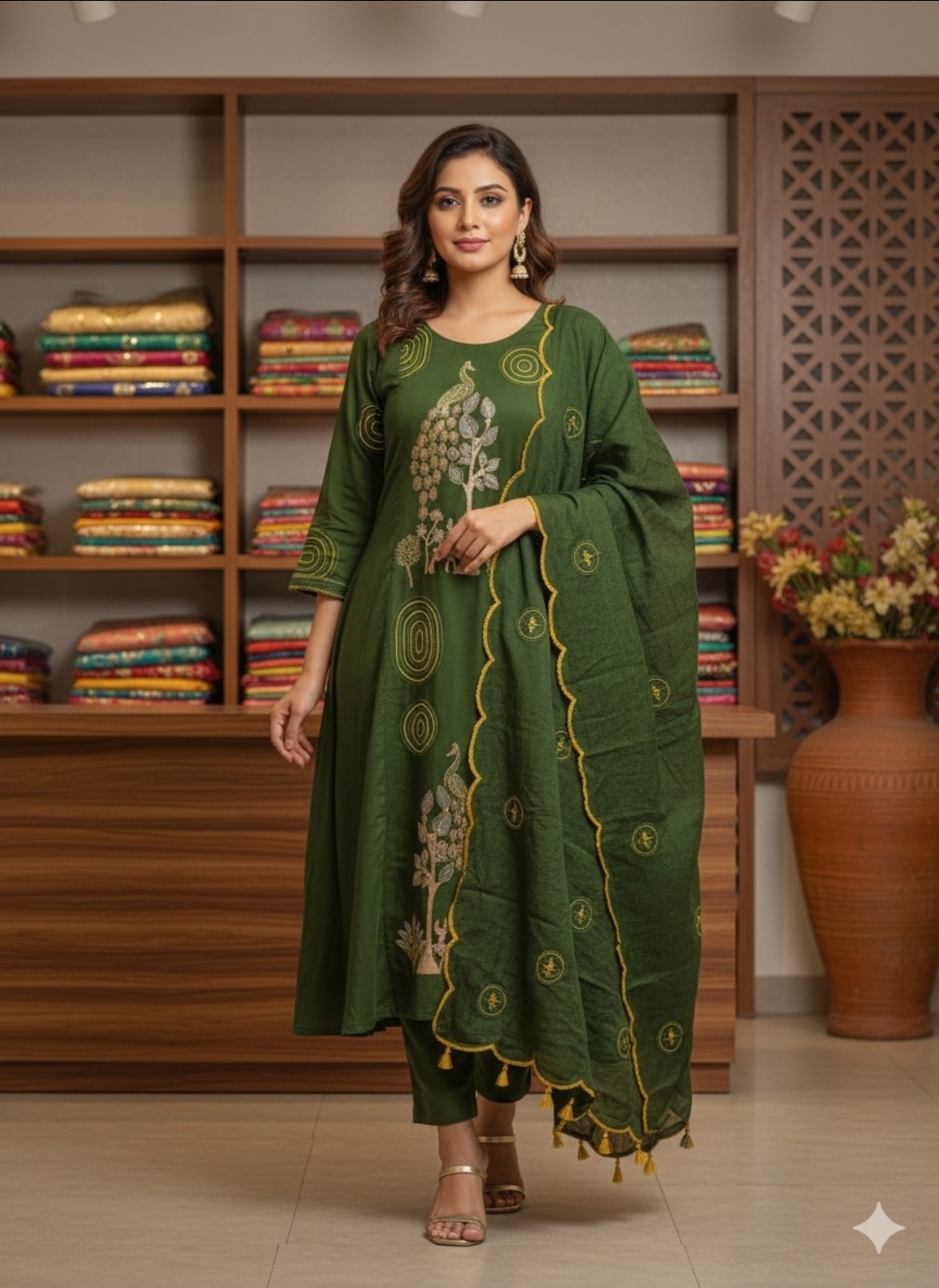 Generic Women Cotton Blend Printed Kurti With Pant Dupatta Set Mehendi
