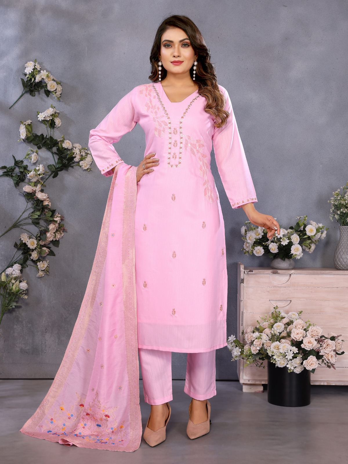 Generic Women s Roman Silk Embroidery Sleeve V-Neck Kurti With Pant Dupatta Set