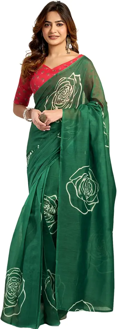 Women s Faux Linen Printed Ready toWear Saree With Unstitched Blouse Dark Green