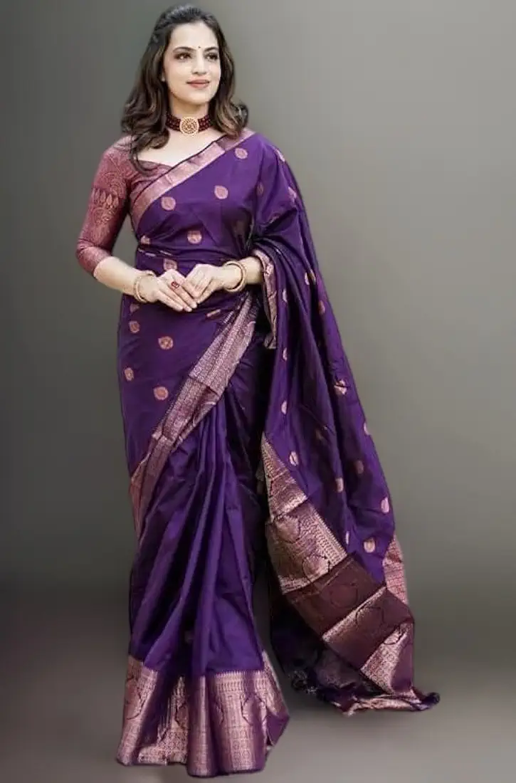 Women s Linen Cotton Printed Saree With Unstitched Blouse Purple