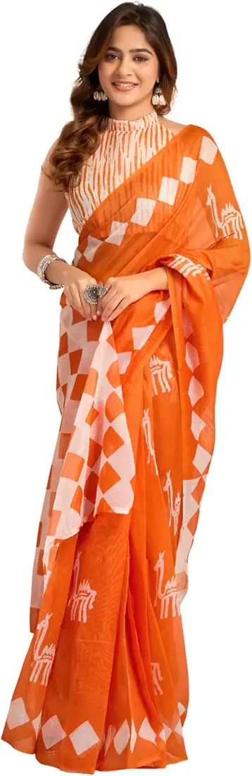 Women s Faux Linen Printed Ready to Wear Saree With Unstitched Blouse Orange