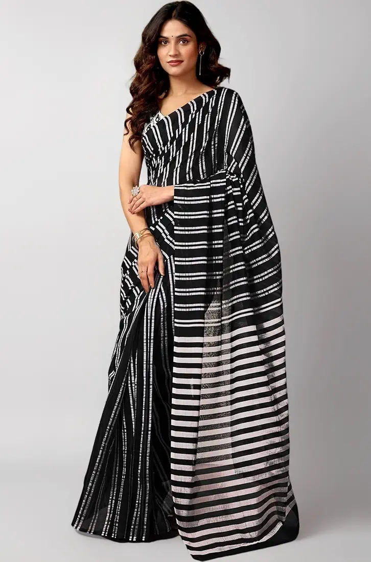 Womens Faux Linen Printed Ready to Wear Saree With Unstitched Blouse Black