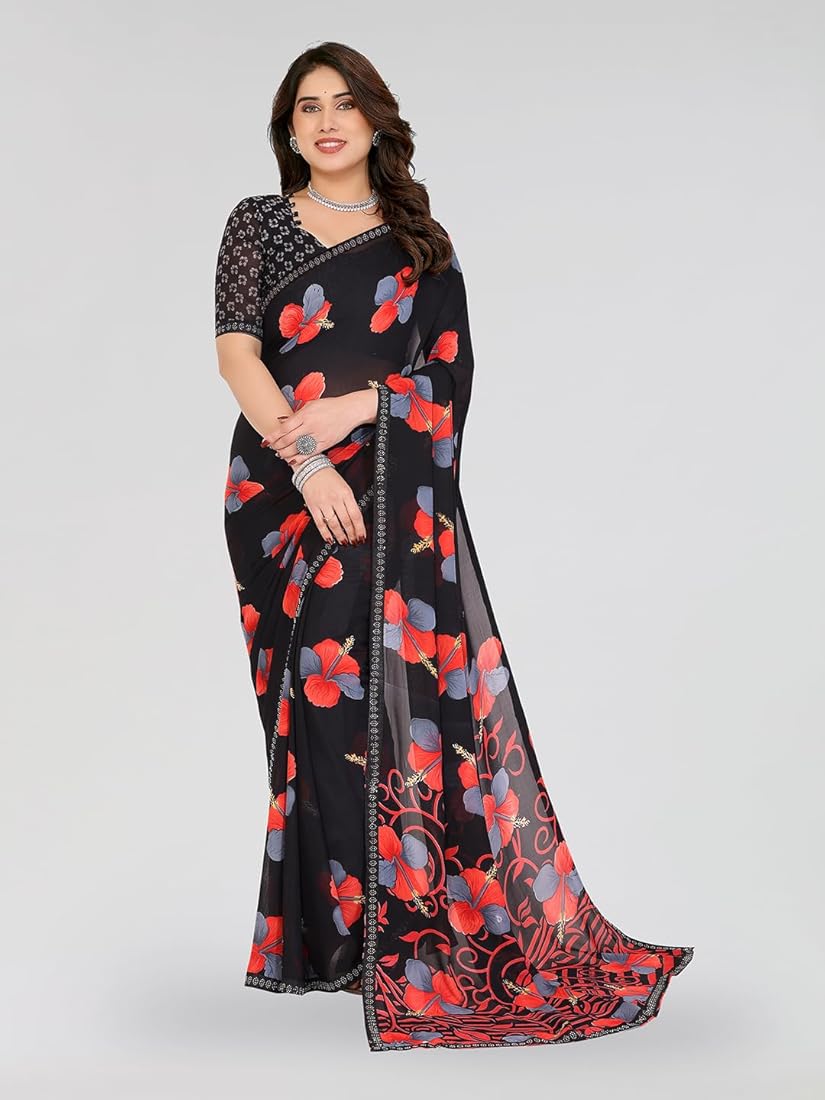 Women s Georgette Printed Saree With Unstitched Blouse Black