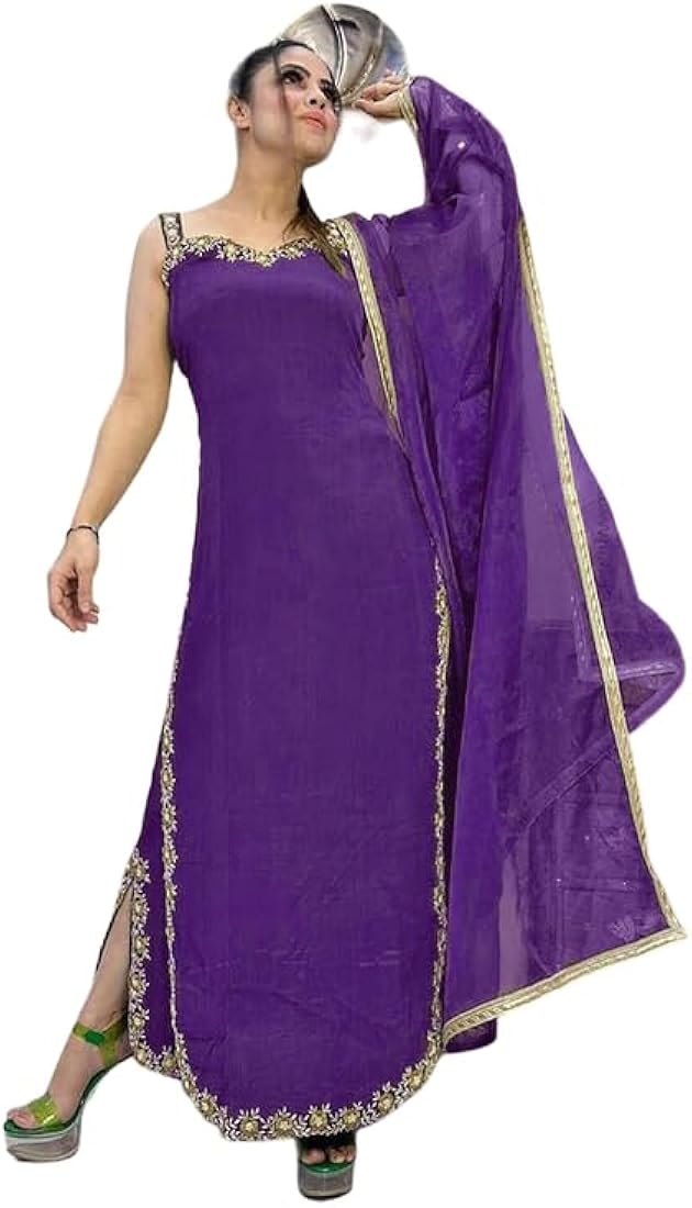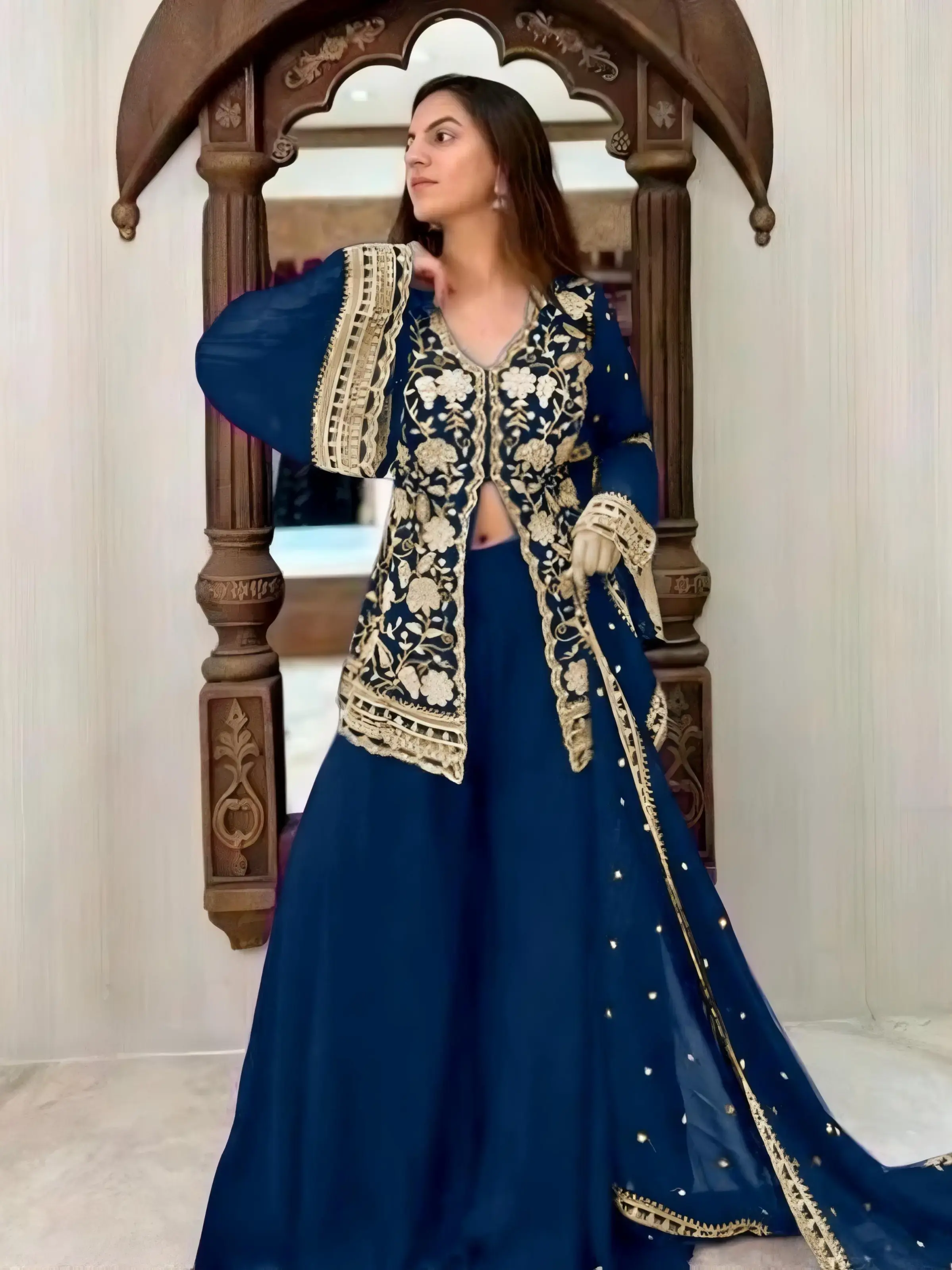 Generic Women s Georgette Embroidery Sleeve V Neck Kurti Palazzo And Dupatta Set