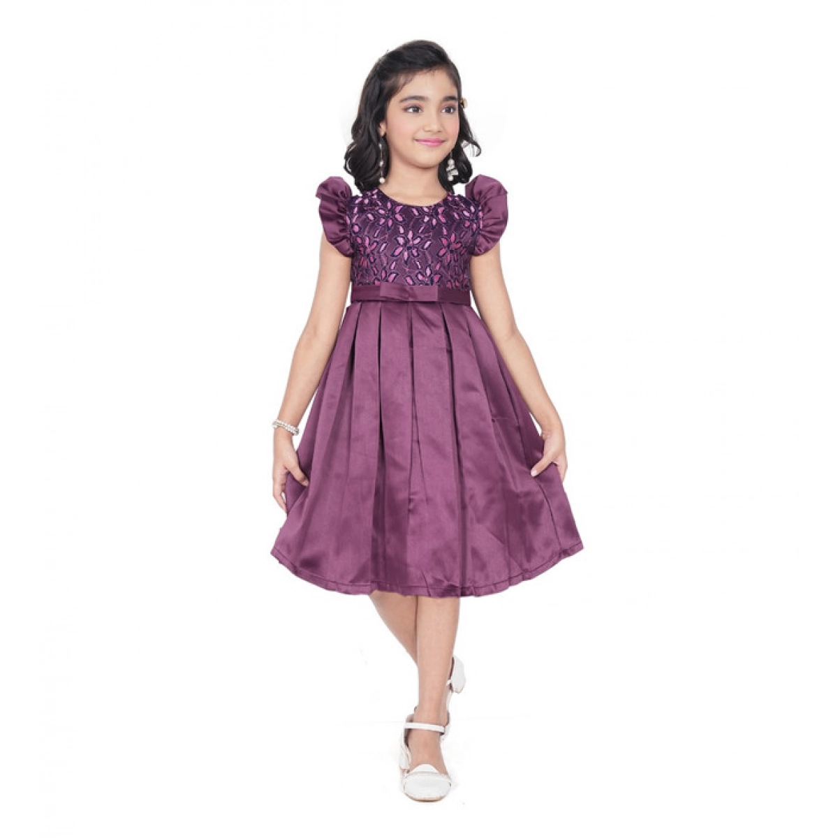 Girl s Satin Printed Sleeve Less Round Neck Dress Purple