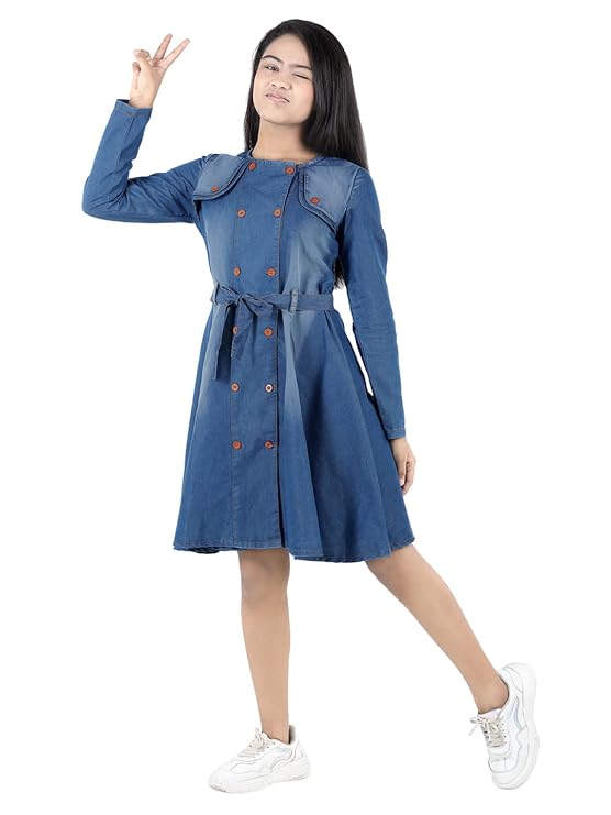 Generic Girls Denim Solid Long Sleeve Round Neck Dress Blue
